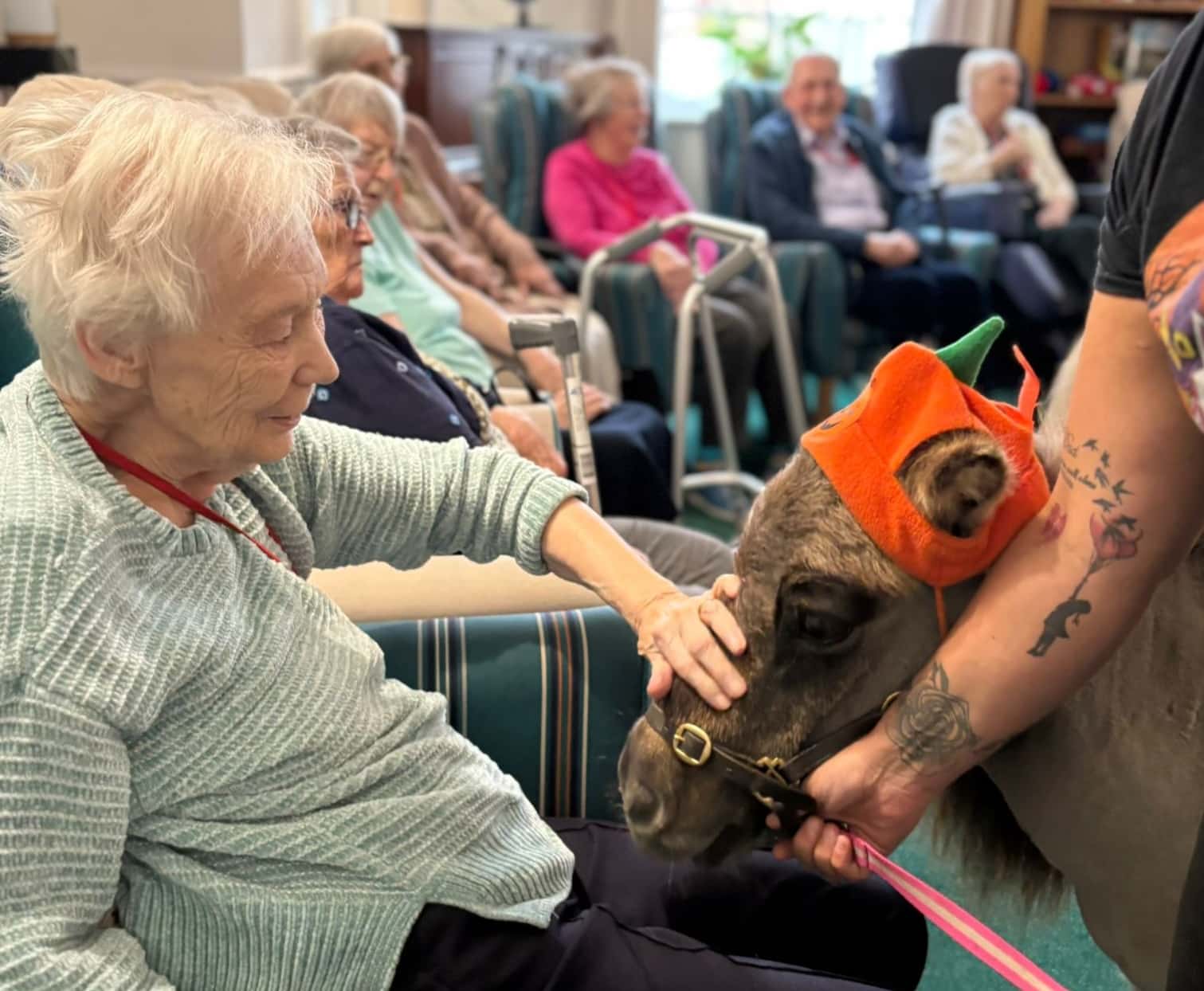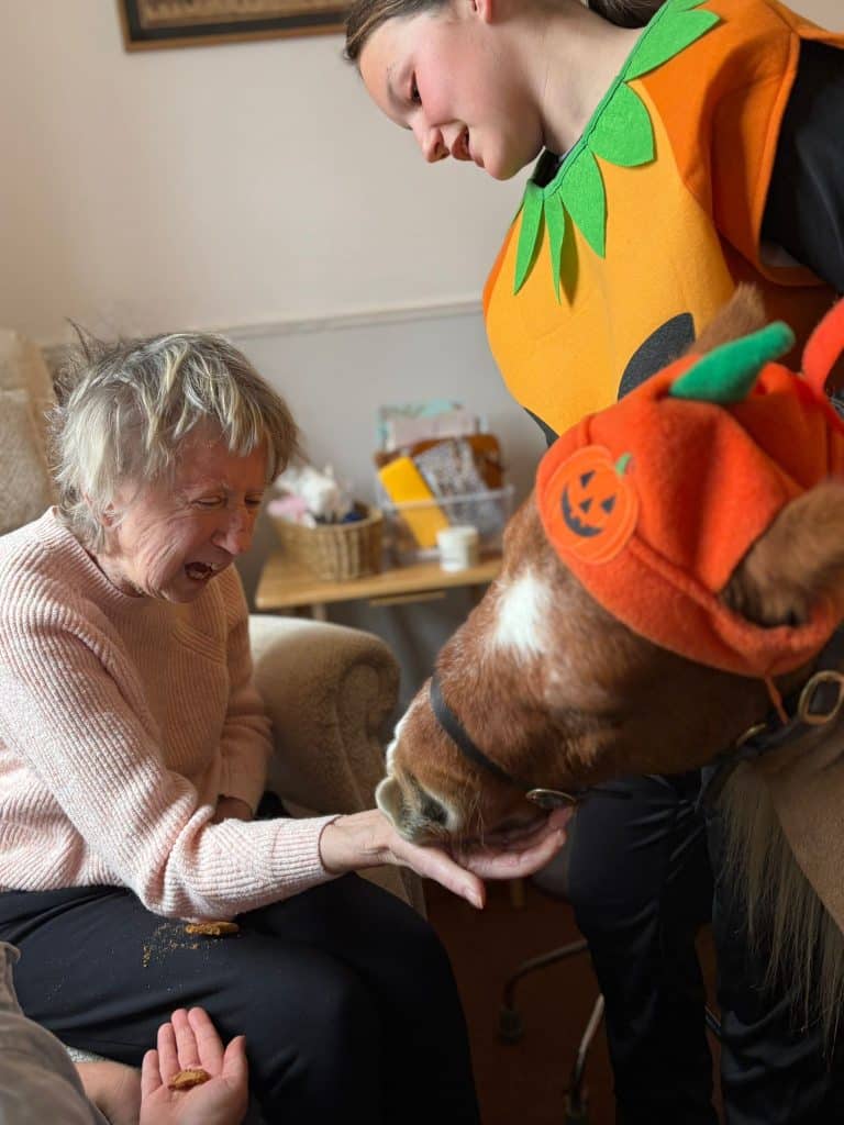 Glebe House enjoyed a wonderfully themed visit when the ponies arrived dressed for Halloween. Residents were surprised and delighted to see these tiny, charming ponies trotting into the home wearing festive Halloween outfits – a sight that instantly lit up the room.